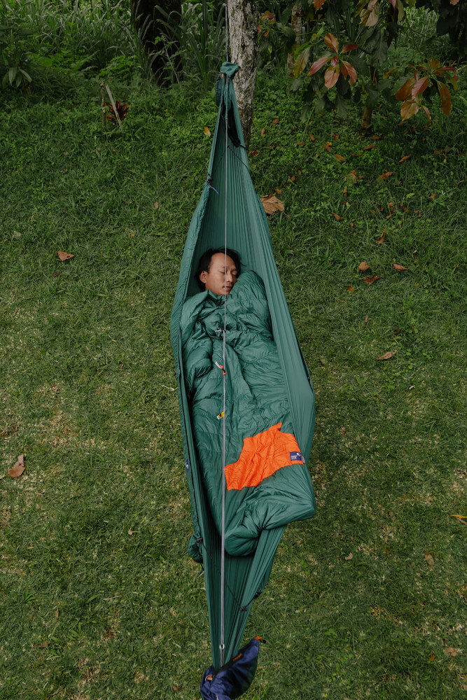 A magasabb szintű függőágyazás alapkelléke egy topquilt. Miután az alsó szeigetelésed már megvan (ami elengedhetetlen a függőágyban alváshoz), szükséged lesz egy kompakt méretű takaróra. A hálózsák innetől felesleges, és amúgy is macerás a használata függőágyban. A topquilt körülöleli a lábad, így nem csúszik le semerre. A poncsó funkció pedig hab a tortán :)